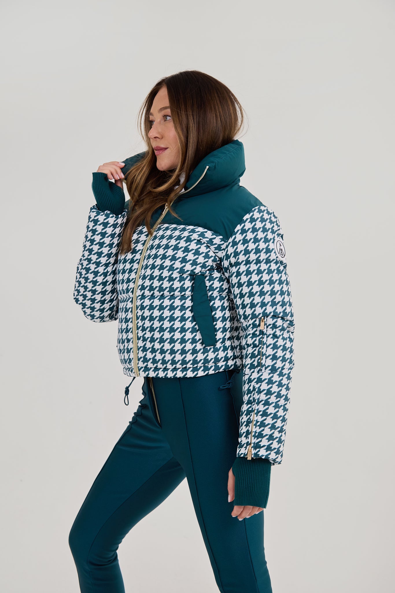Cropped Bomber Ski Jacket - Teal Houndstooth